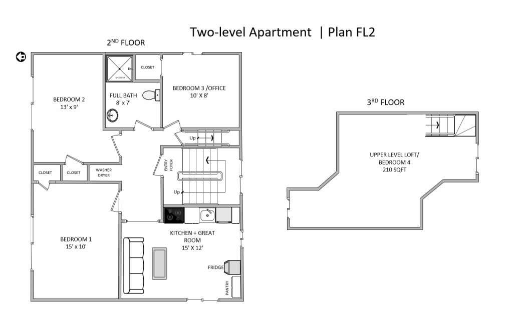 This unique three-bedroom apartment spans two levels of the building — the entire second floor and a fully finished third-floor attic. The two levels are connected by an interior staircase, creating a spacious multi-level layout. The bright, finished attic functions as a private bedroom suite and can serve as a fourth bedroom, home office, studio, or quiet retreat.