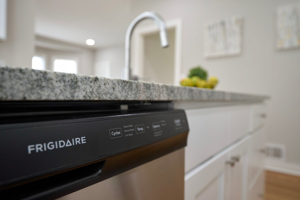 The modern kitchen is equipped with granite countertops and stainless-steel appliances, including a dishwasher, stove, refrigerator, garbage disposal, and microwave. Energy-efficient windows and a high-efficiency heating system help maintain year-round comfort while keeping utility costs low.